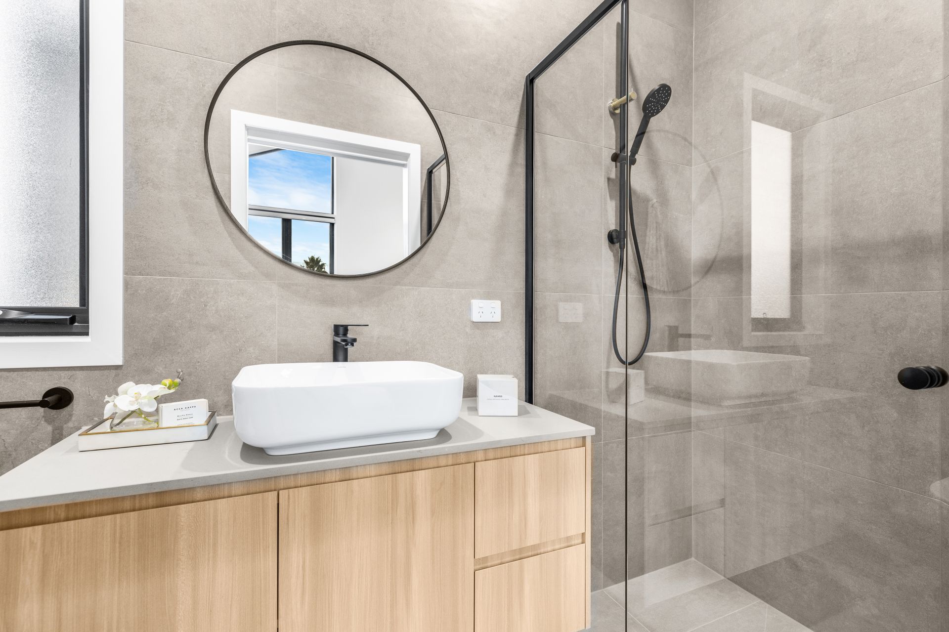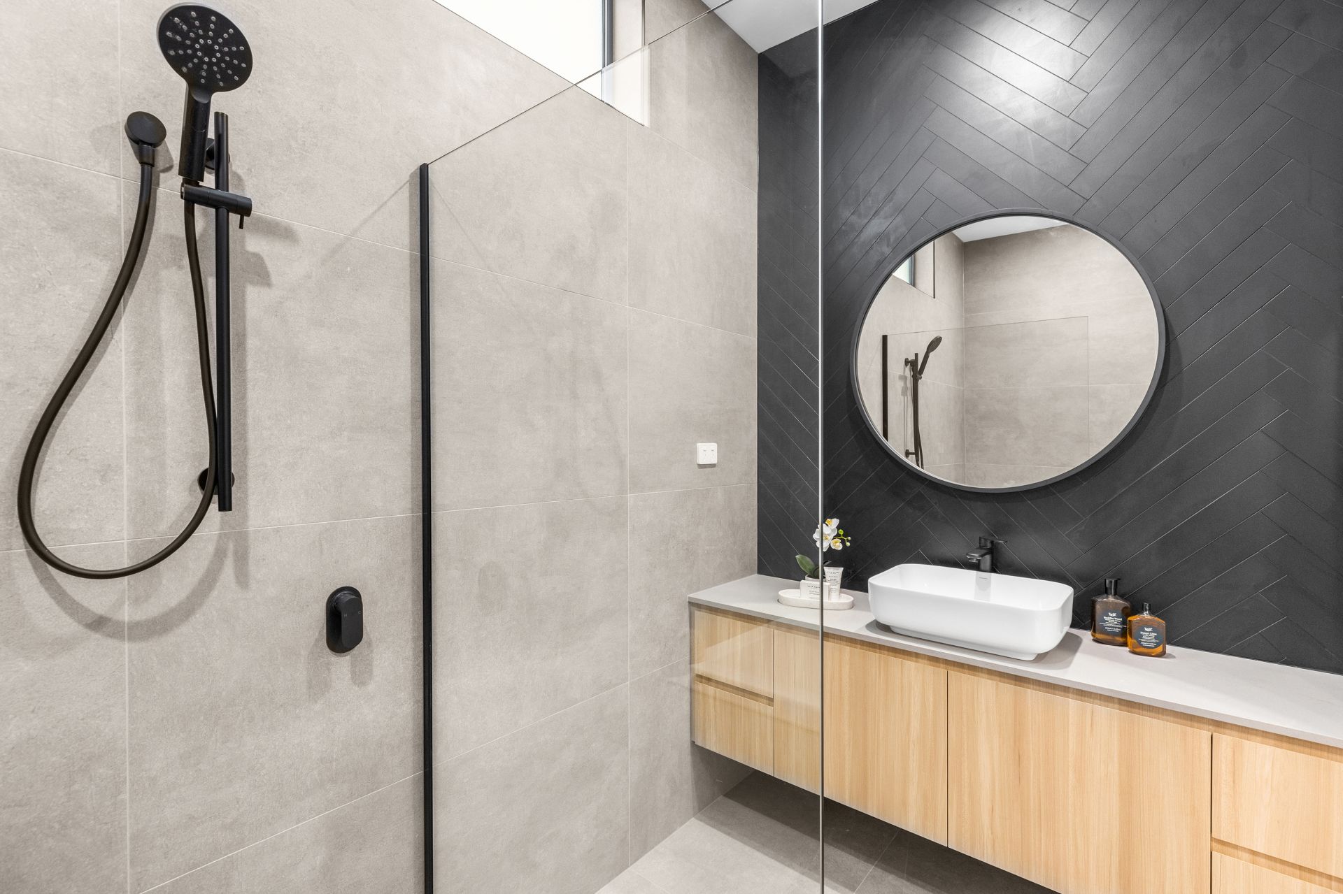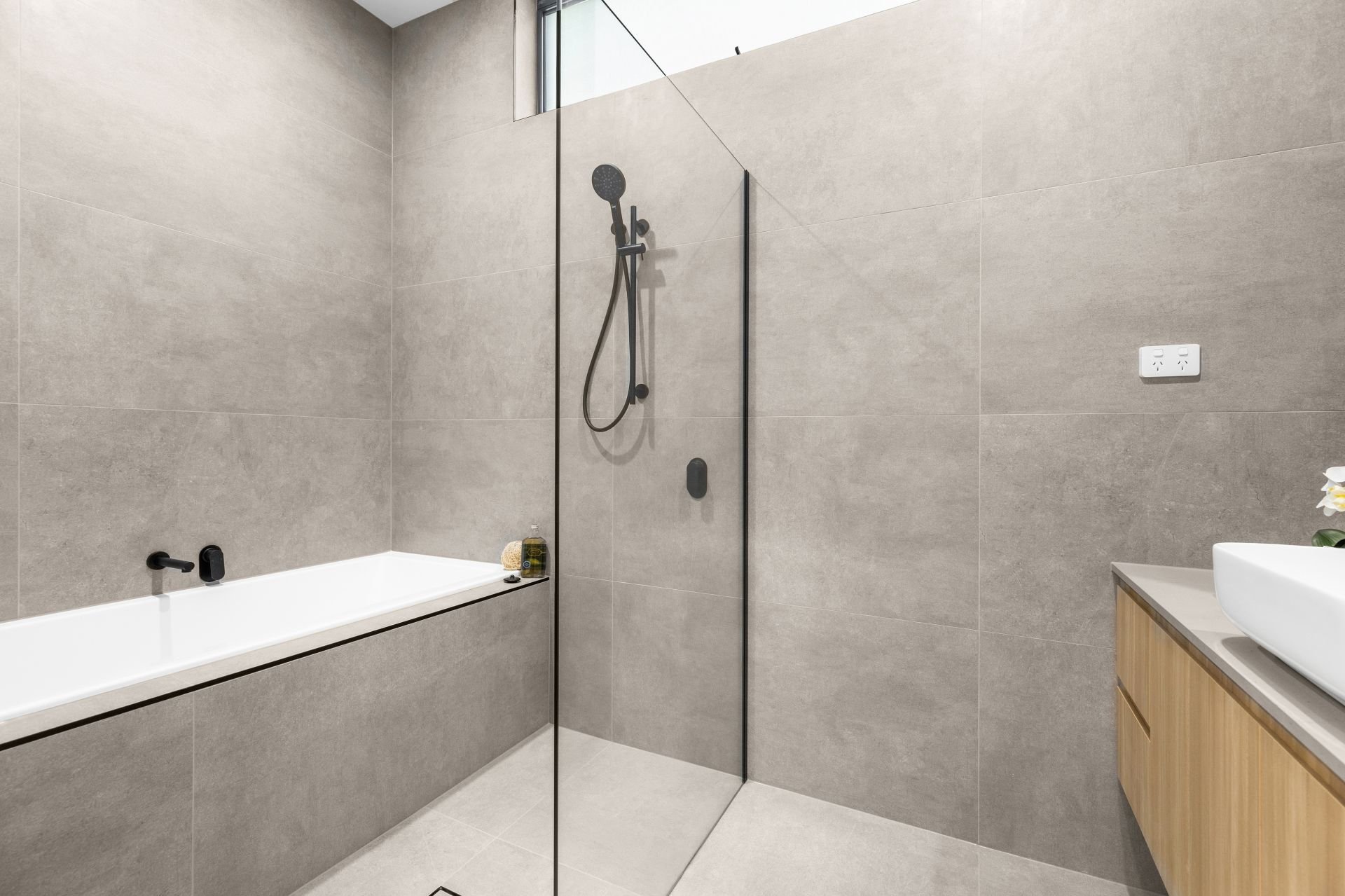 Main bathroom with floor to ceiling tiles, matte black tapware