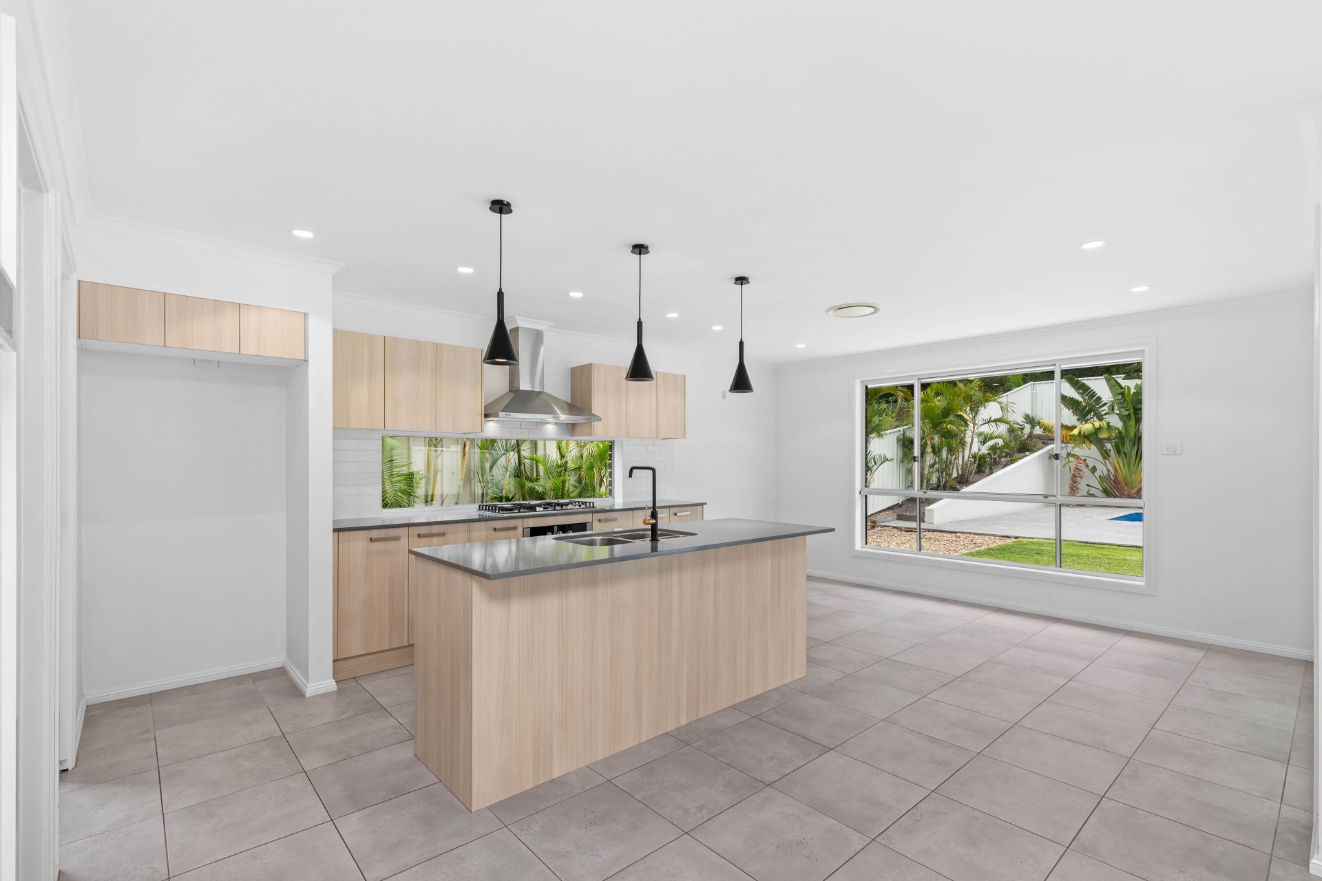 - Tiled open plan living area leads to the entertaining and inground pool