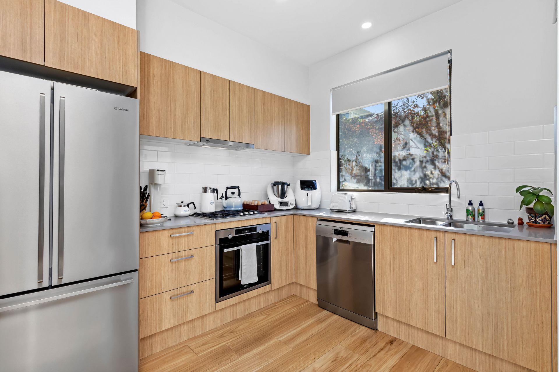 - Contemporary kitchen with stone benchtops, fridge, stainless steel appliances and gas cooking