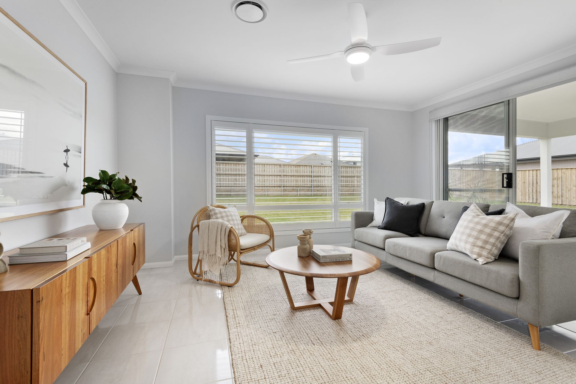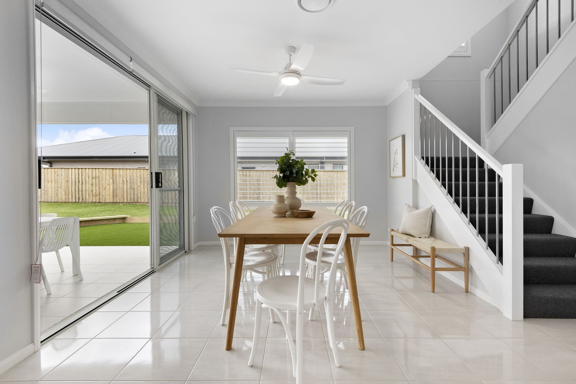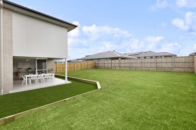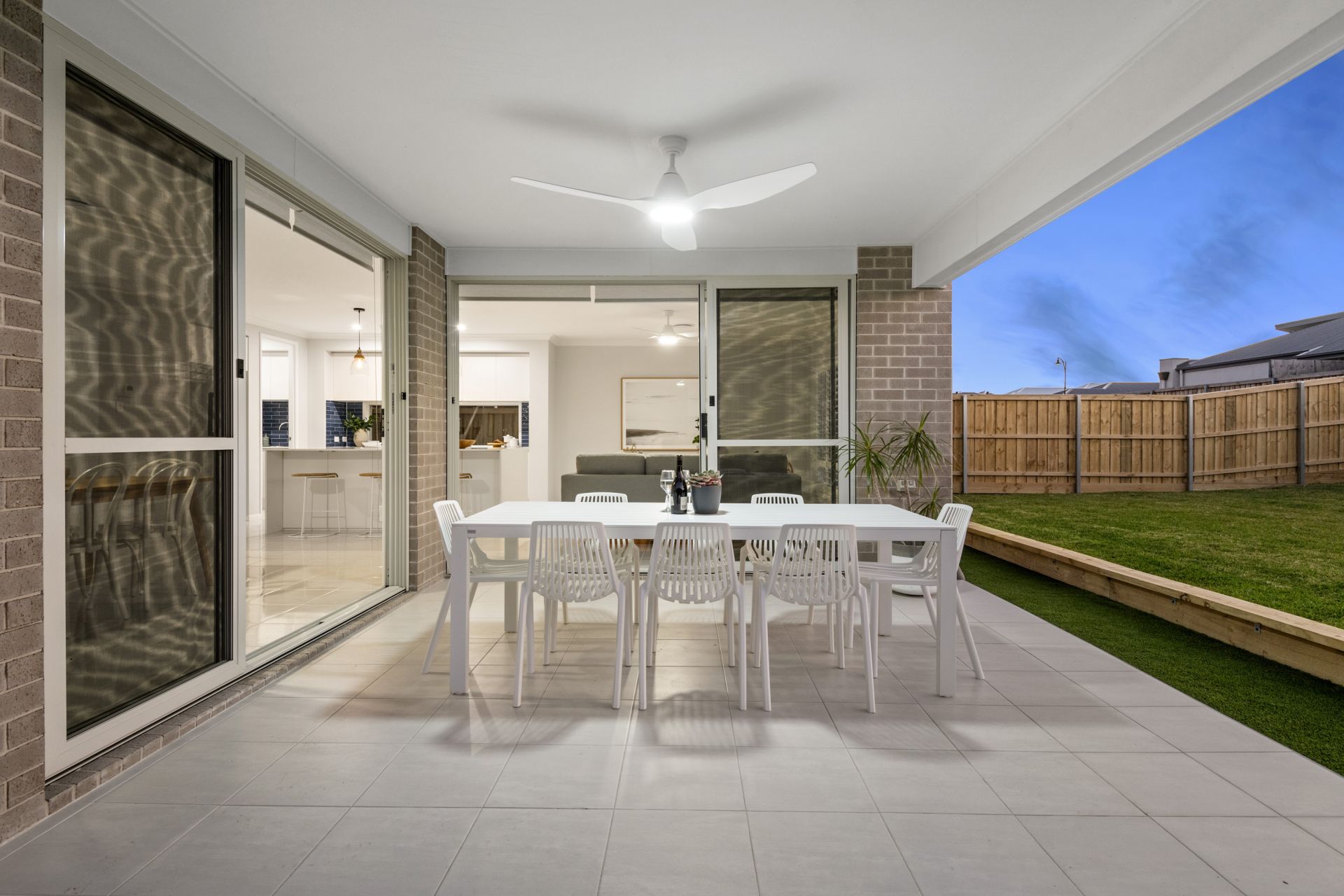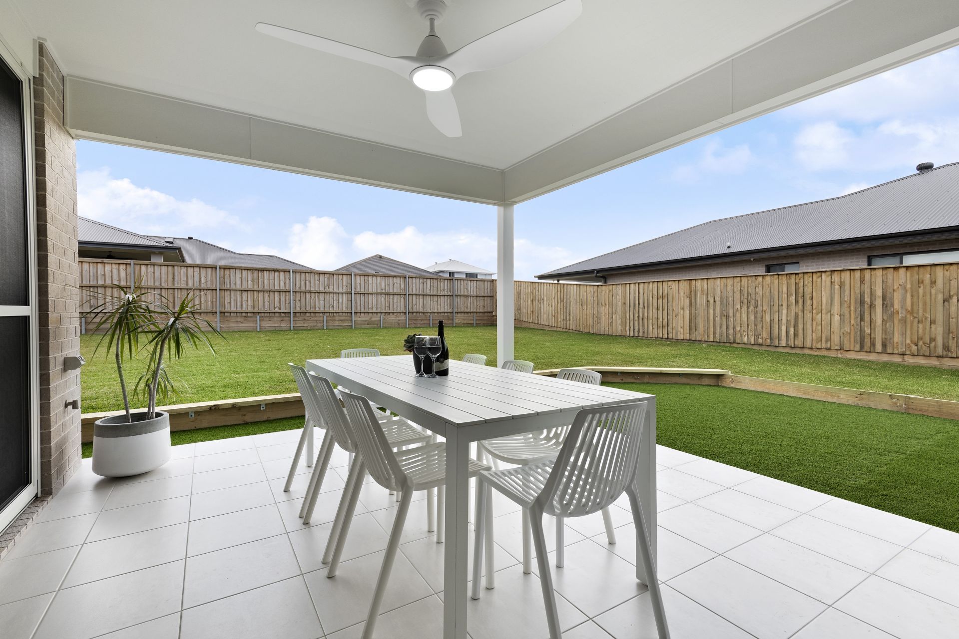 -Outdoor Entertaining: Covered alfresco with ceiling fan, gas bayonet, lighting, and non-slip tiles, overlooking a fully fenced yard with natural and synthetic turf.