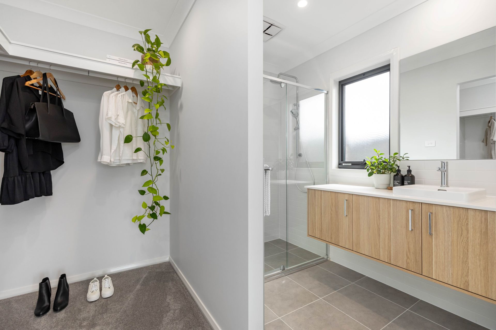 • Modern main bathroom with a stylish timber vanity, a bath, and a shower