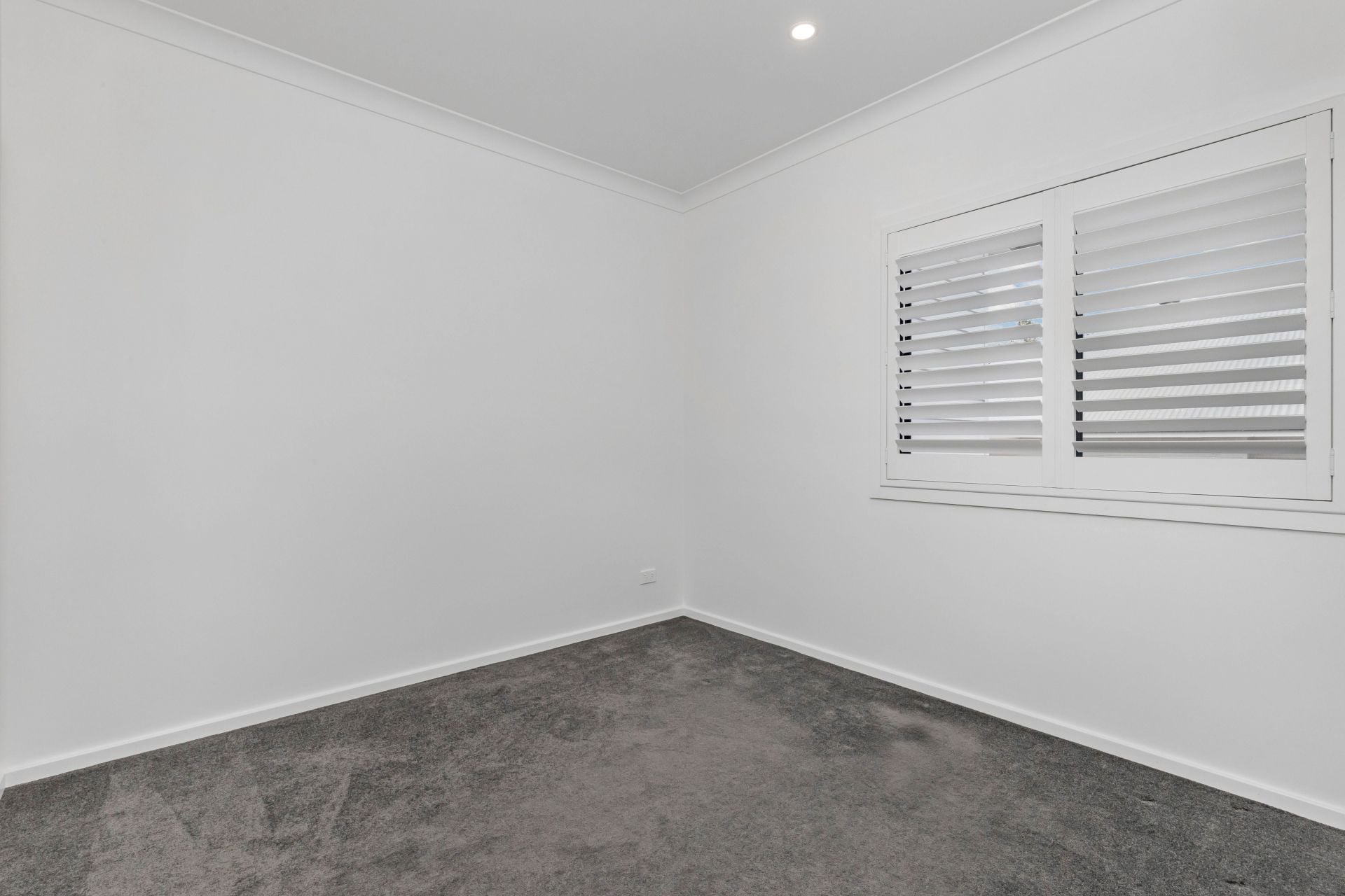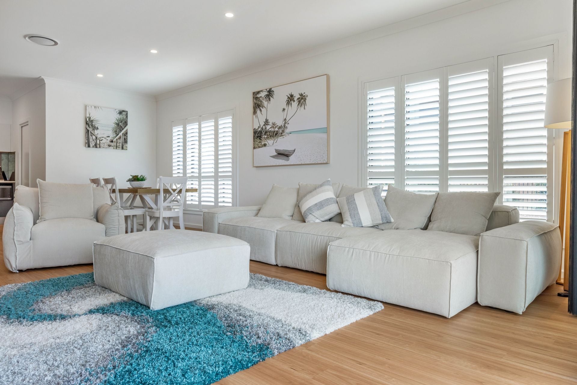 · Plantation shutters throughout, excluding the back sliding doors, where modern S-fold curtains hang.