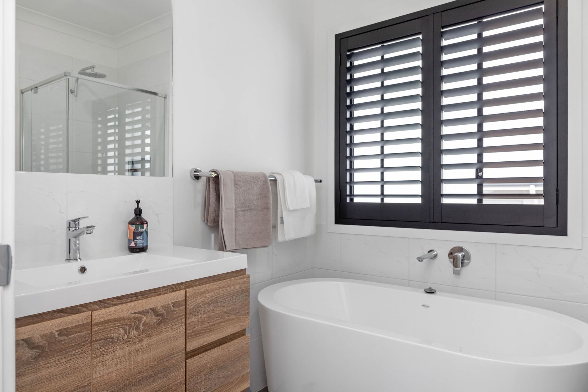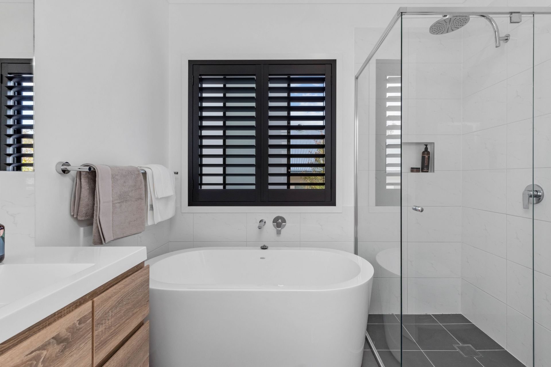 · Well-appointed main bathroom with a shower and a freestanding bath, ideal for relaxation.