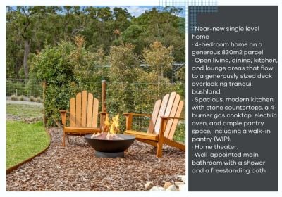 This near-new 4-bedroom home is set on a meticulously landscaped 830m2 parcel, offering a harmonious blend of luxury and nature. As you step inside, you're greeted by an expansive open-plan layout with multiple living areas that invite relaxation and connection. The large glass sliding doors seamlessly merge indoor and outdoor living, leading you to a stunning deck where you can unwind while taking in the tranquil views of the surrounding bushland, a perfect backdrop for alfresco dining or simply soaking in the serenity.