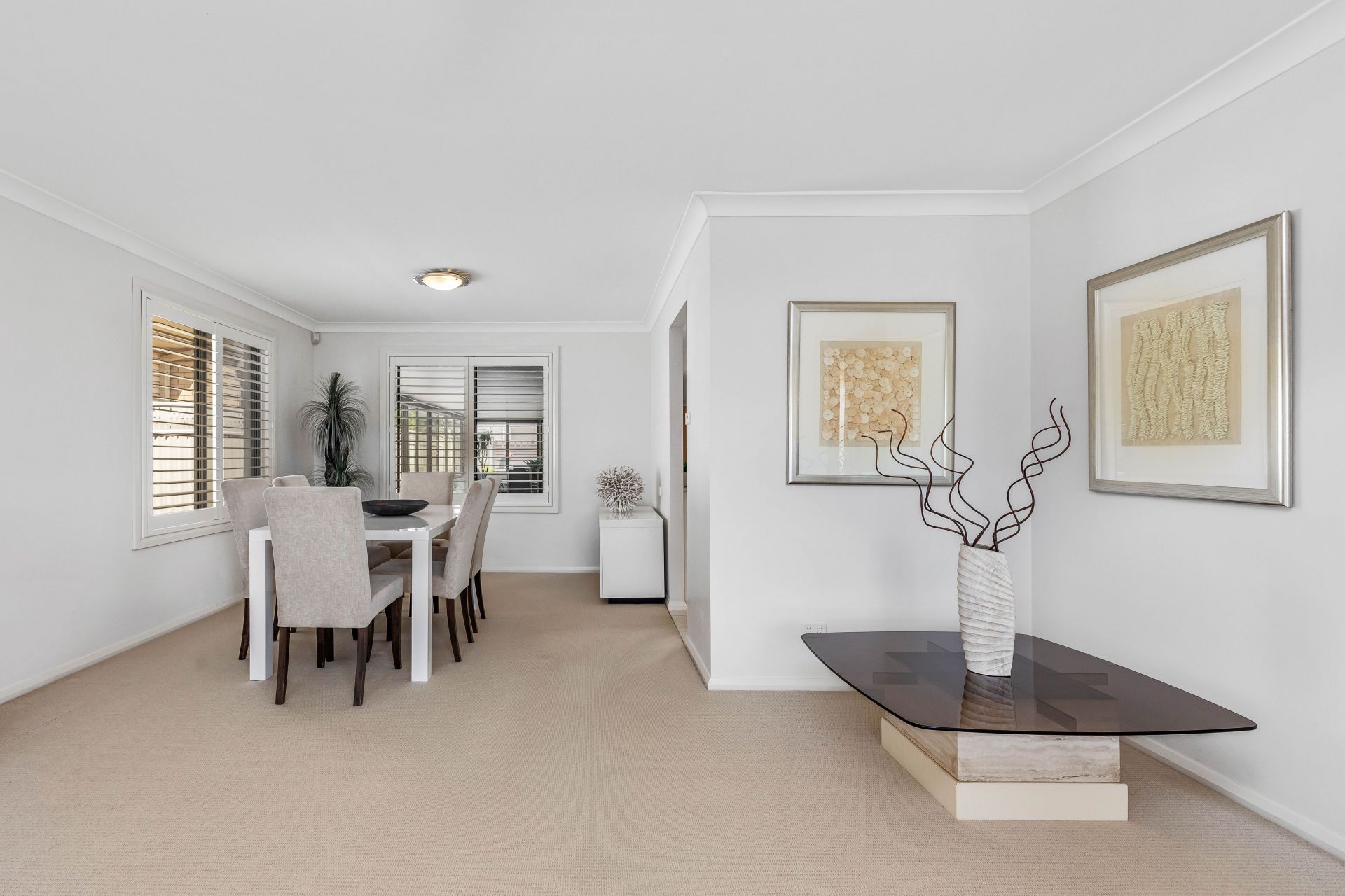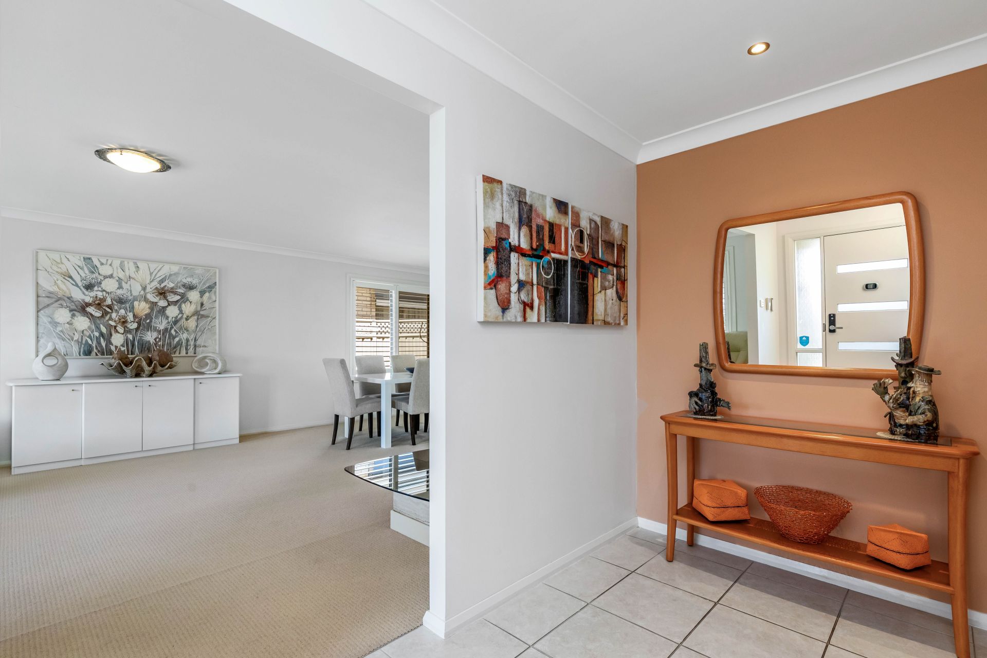 – Tiled entry extends through the kitchen, dining, and lounge areas, transitioning to plush carpeting in the formal dining, living, and bedrooms