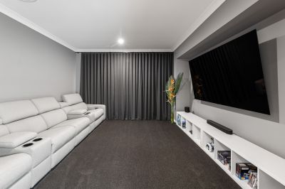 At the heart of the home, expansive open-plan living and dining areas are flooded with natural light, seamlessly connecting to a chef's kitchen complete with gas cooking, a 900mm oven, and a spacious pantry. Adjoining this space is a designated media room with blockout curtains provide additional living zones for entertaining or quiet nights in.