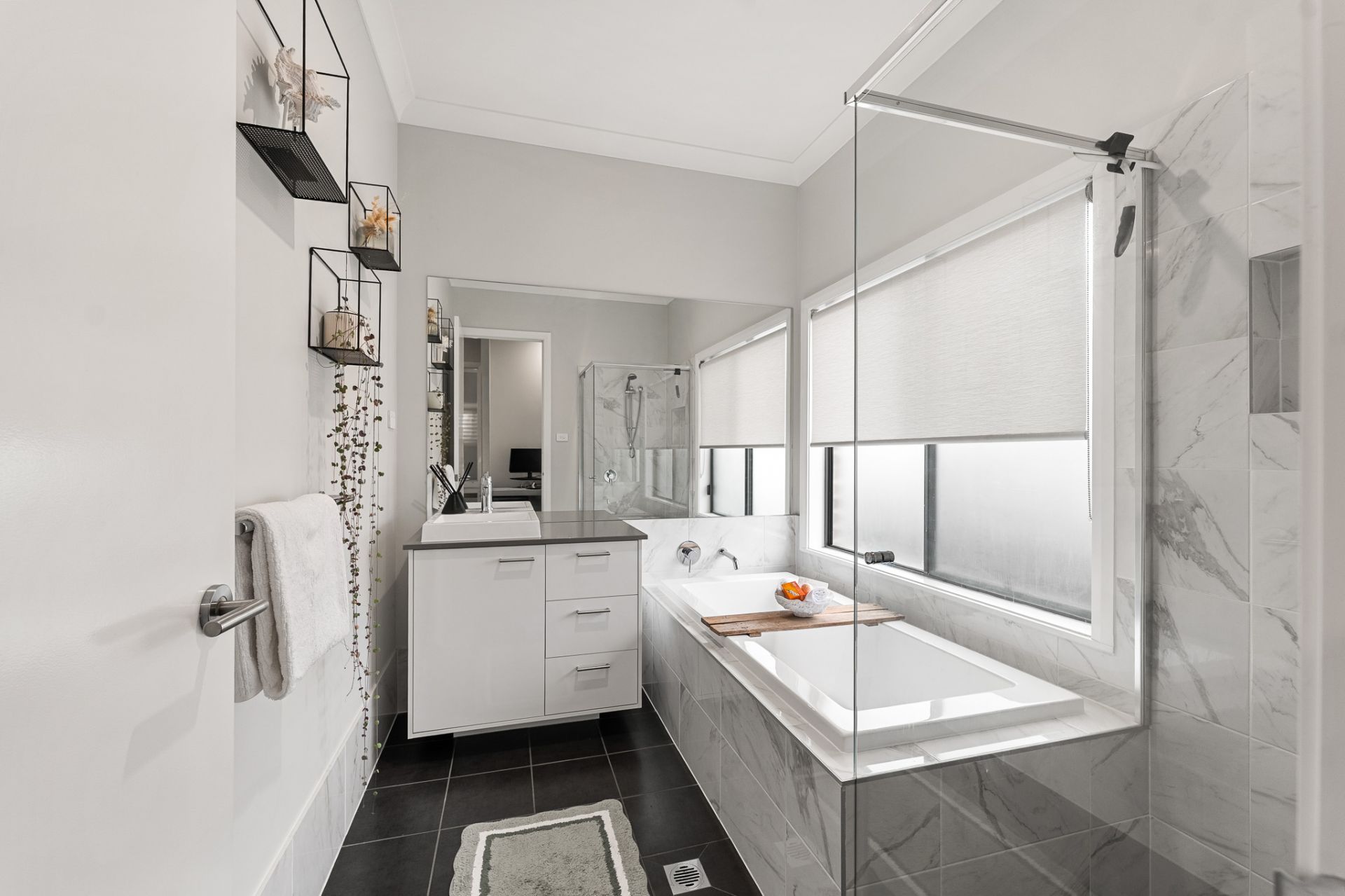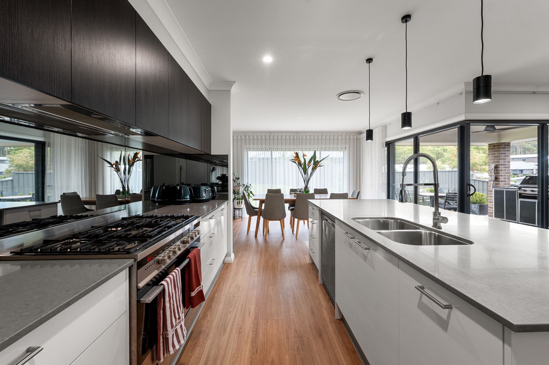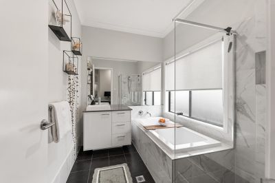 The oversized master suite is a true sanctuary, boasting a walk-in robe and a luxurious ensuite with twin basins.