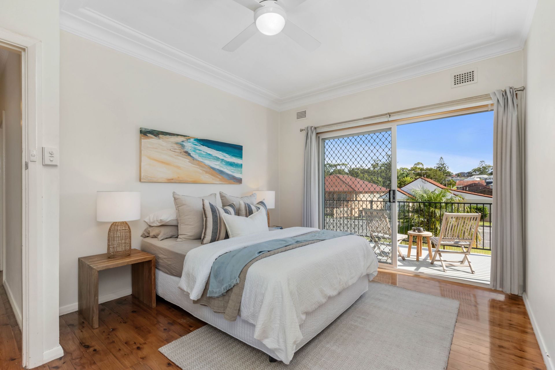 -Bedroom 1 includes a ceiling fan, a generously sized wardrobe, and balcony access