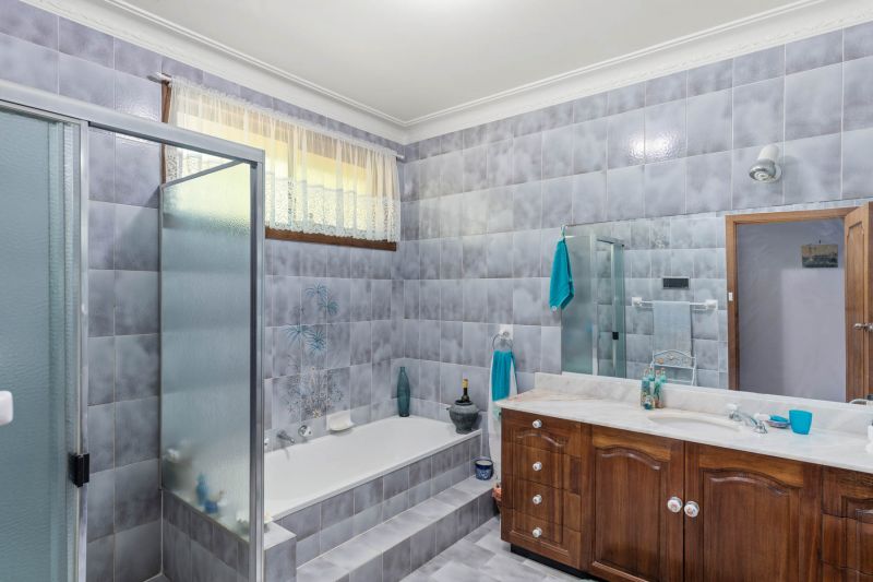• Bathroom with floor-to-ceiling tiles, shower, bath, and timber vanity basin