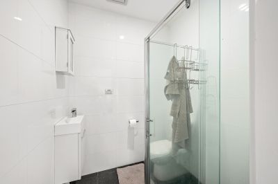 -Main bedroom featuring an ensuite with shower and W/C, ceiling fan, and reverse‑cycle air conditioning
