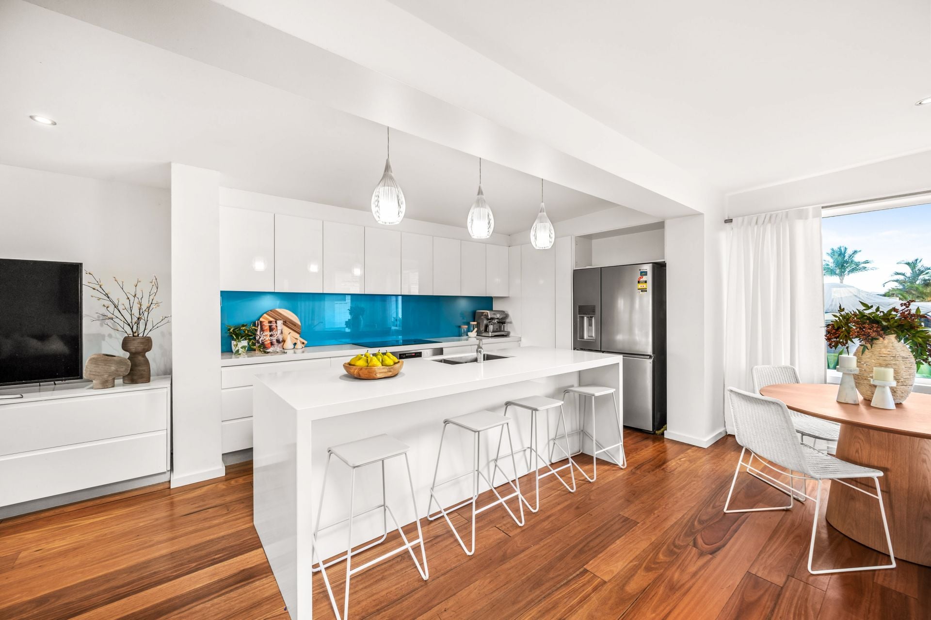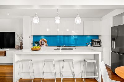 -Modern, sleek white kitchen with a large island bench/breakfast bar and ample cabinetry