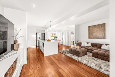 Inside, the layout is centred around open‑plan living, with a generous lounge zone flowing to the kitchen and dining area. The kitchen is bright and modern, featuring a large island bench that naturally becomes the hub for morning coffees, after‑school snacks, and weekend catch‑ups. Wide openings and large‑scale doors connect the living zone to the covered alfresco, creating effortless indoor–outdoor flow that suits Newcastle's climate and makes entertaining feel easy and natural.
