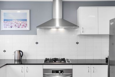 • Modern, sleek white kitchen featuring a black granite benchtop, 4-burner gas cooktop, electric oven, dishwasher and ample pantry space