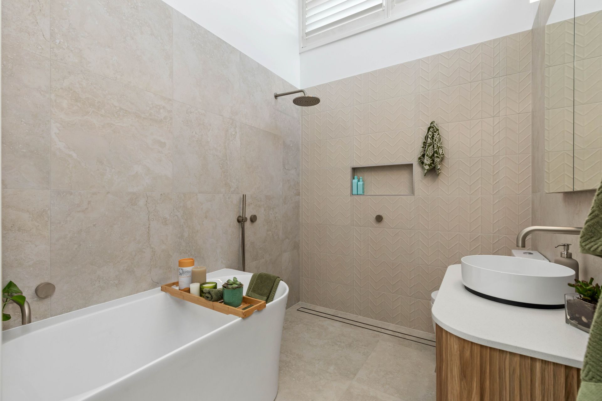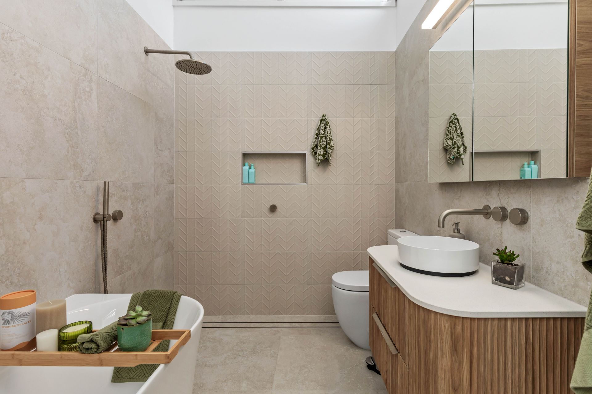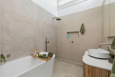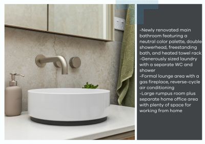 -Newly renovated main bathroom featuring a neutral colour palette, double showerhead, freestanding bath, and heated towel rack.
