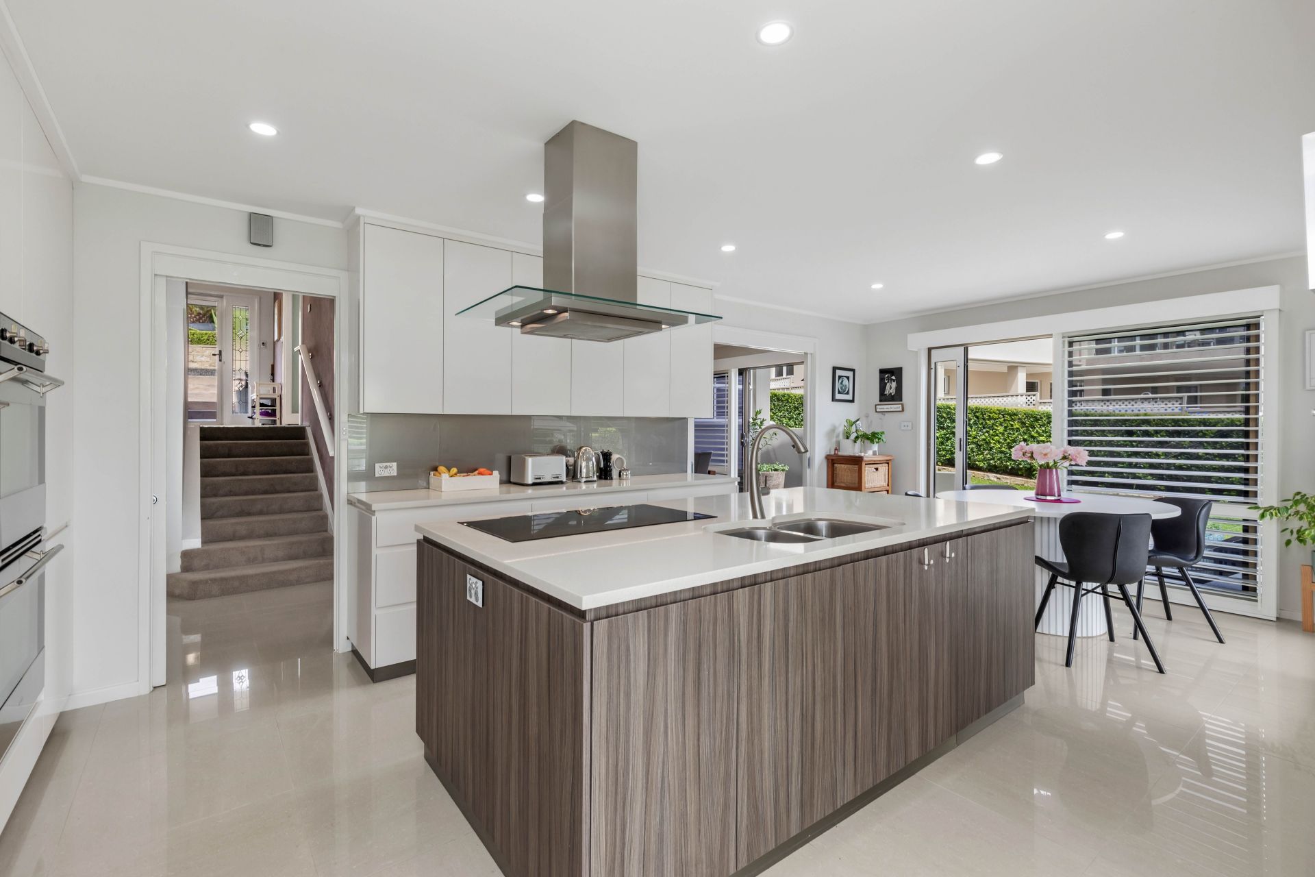 -Modern timber and white kitchen featuring a striking Caesarstone island bench and high-end SMEG appliances, including an induction cooktop, convection microwave, double oven, warming drawer, and Siemens dishwasher.