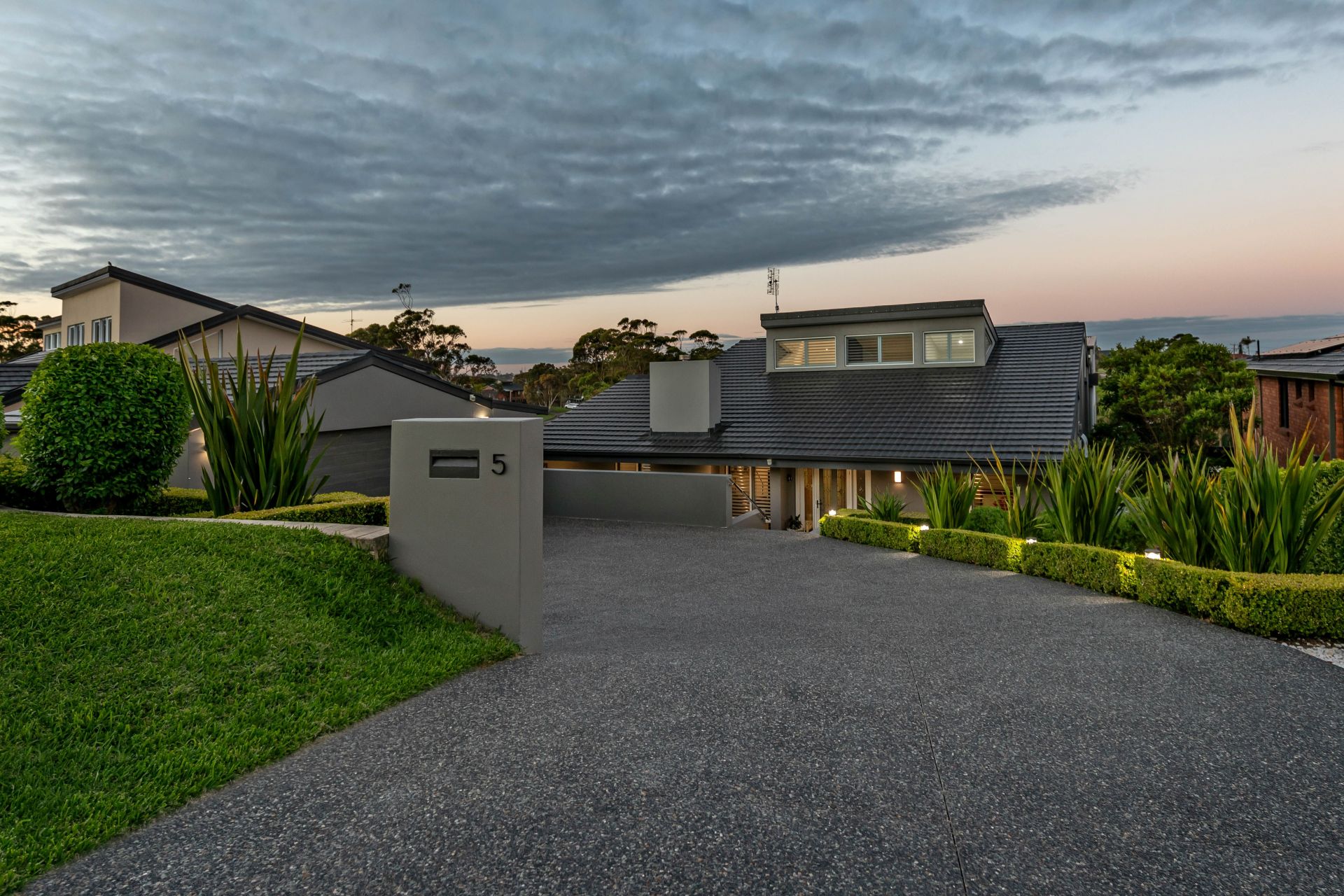 -Modern façade, with the home set back from the street for added privacy.