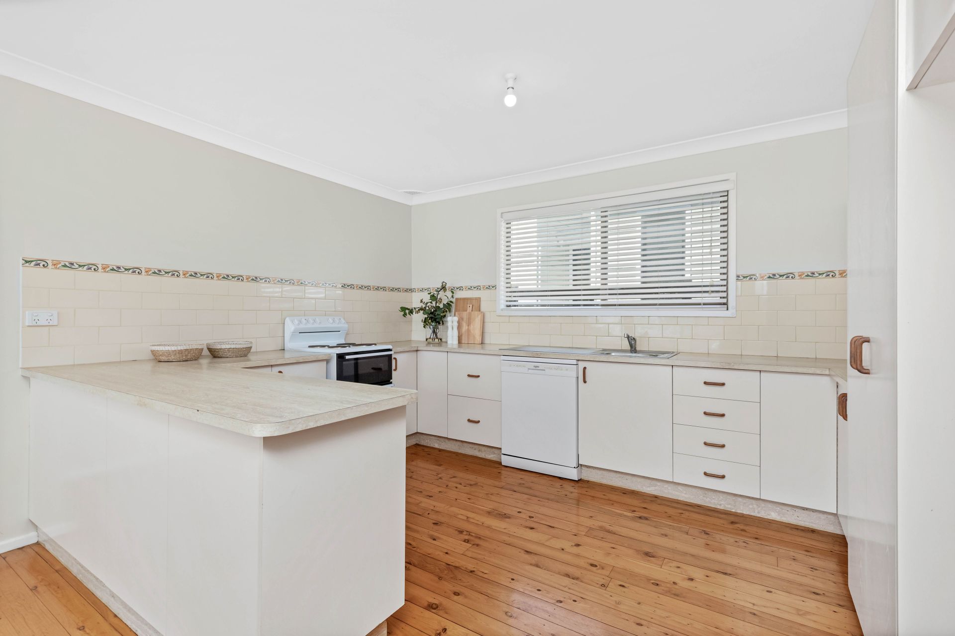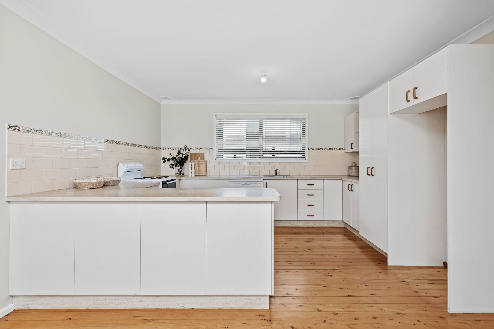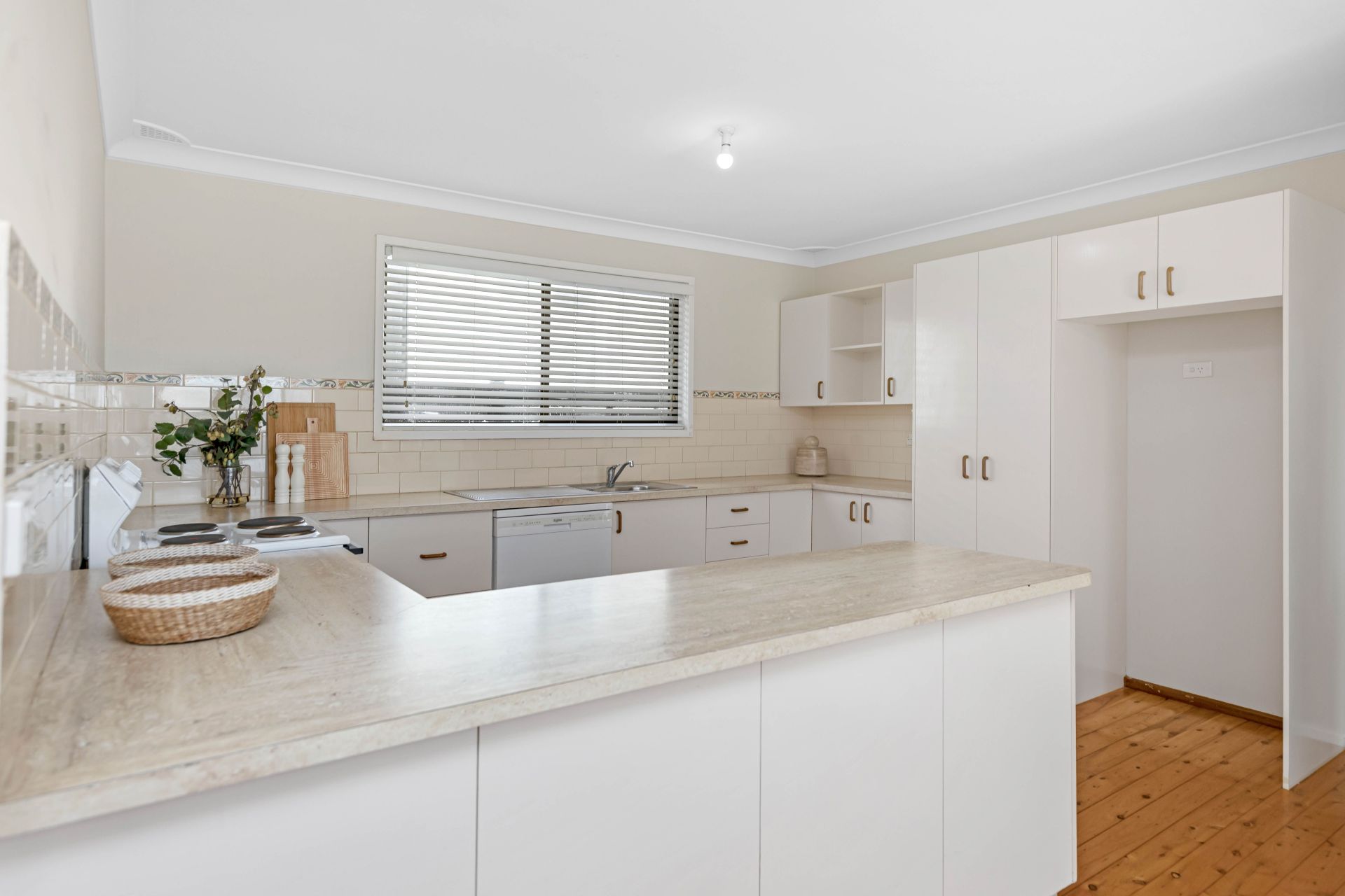 • Generously sized upstairs kitchen with timber accents, ample storage, walk-in pantry, and electric cooking