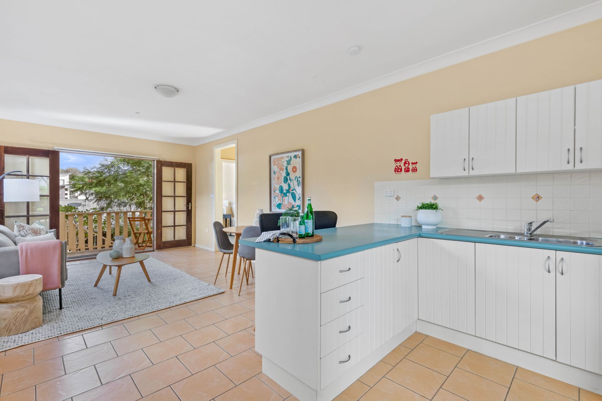 • Upstairs features a light-filled open-plan kitchen, living, and dining space with three bedrooms