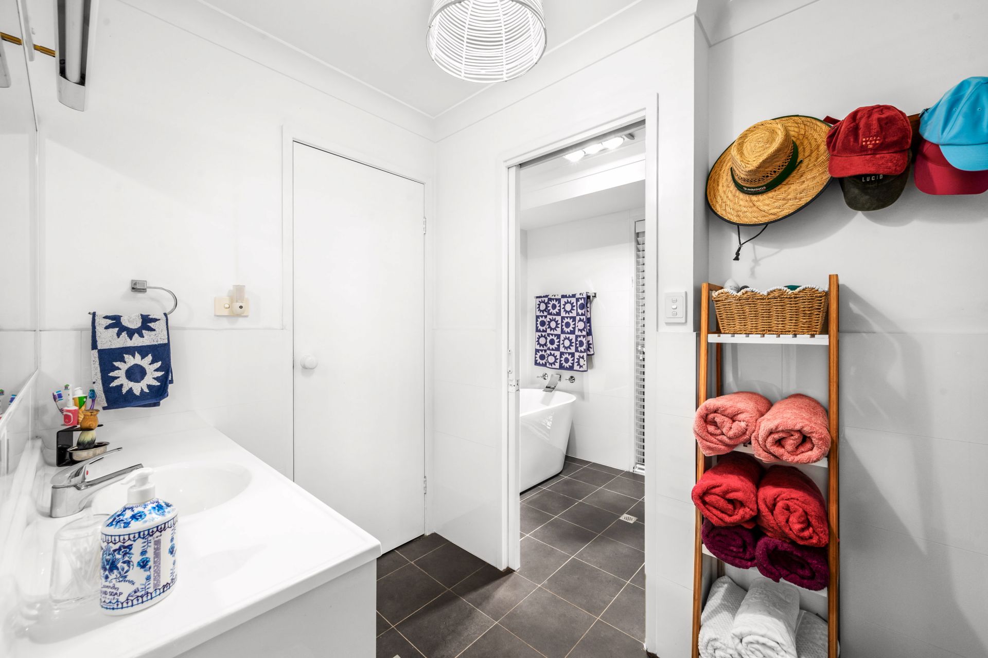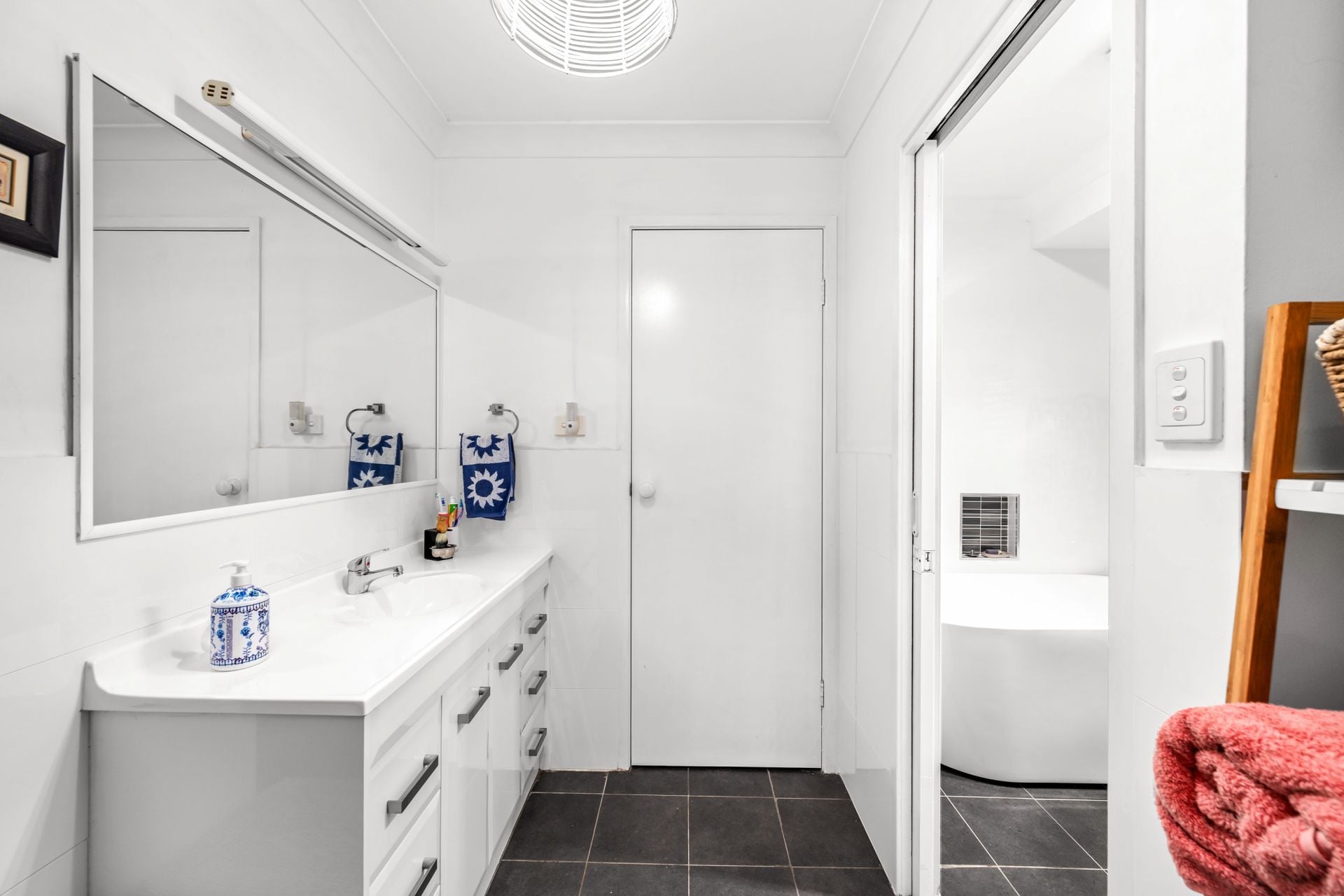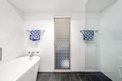 • Modern three‑way bathroom with a dedicated vanity area and separate toilet to help busy mornings run smoothly, a large freestanding bath and shower, plus an adjacent internal laundry