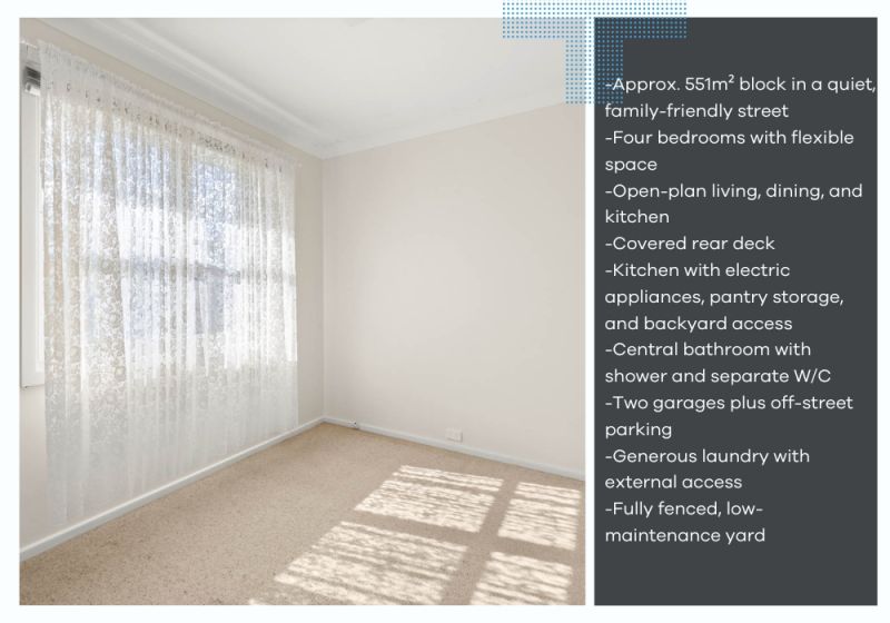 • Four-bedroom home offering generous space and functionality for families, first-home buyers, or renovators