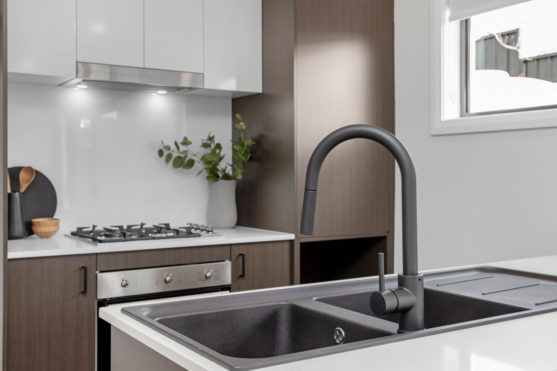 Modern kitchen with premium timber cabinetry, black accents, and European appliances.