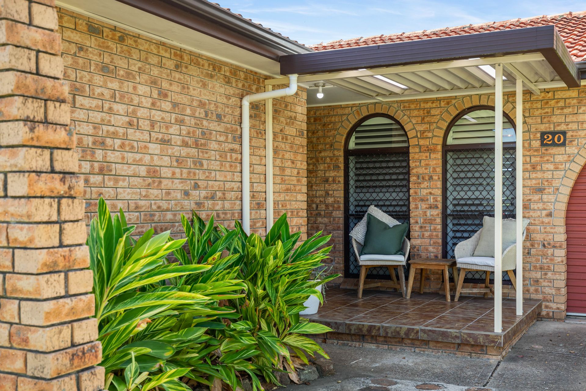 -Low-maintenance gardens and established greenery framing the home