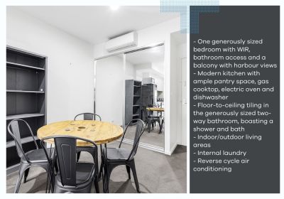- One generously sized bedroom with WIR, bathroom access and a balcony with harbour views