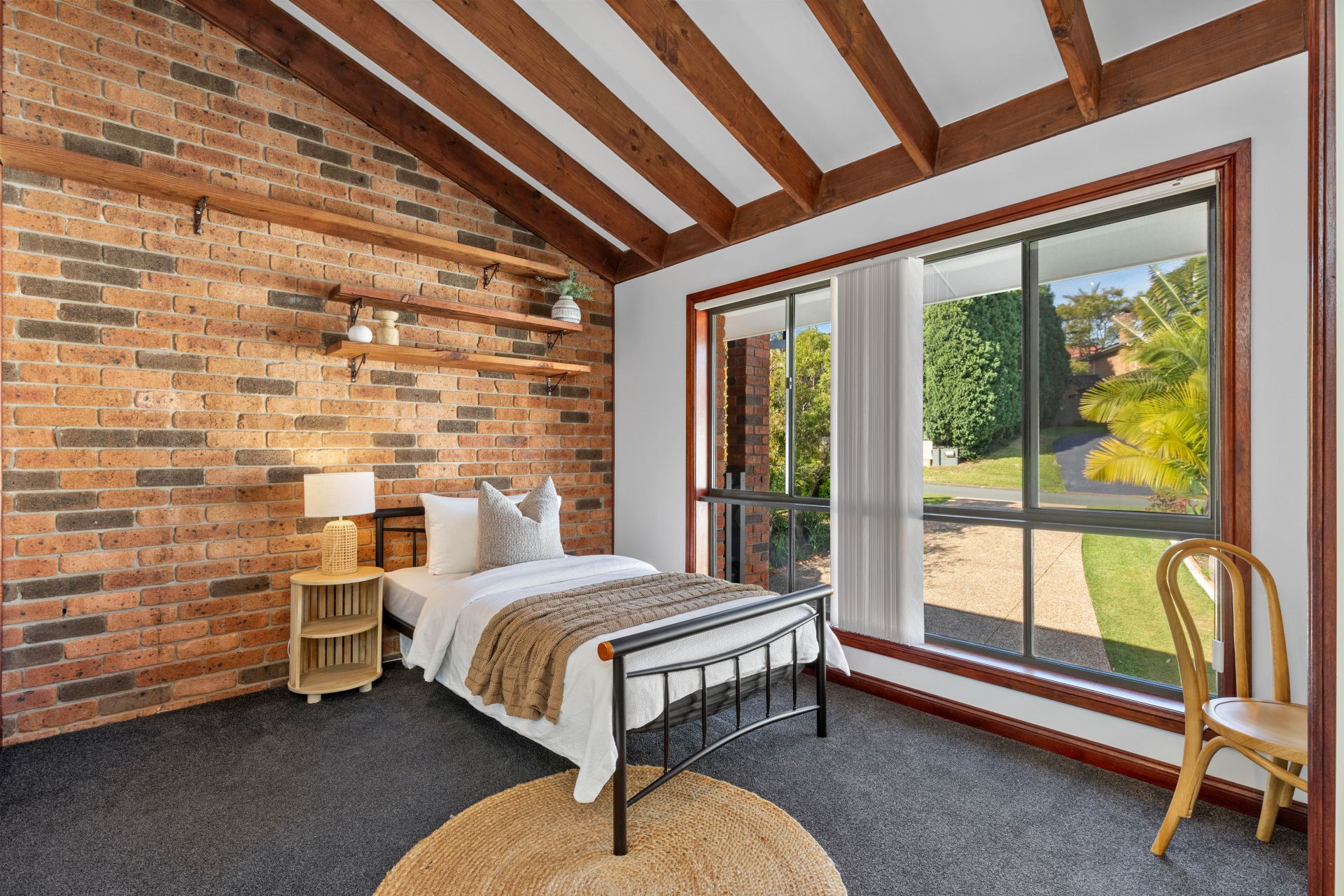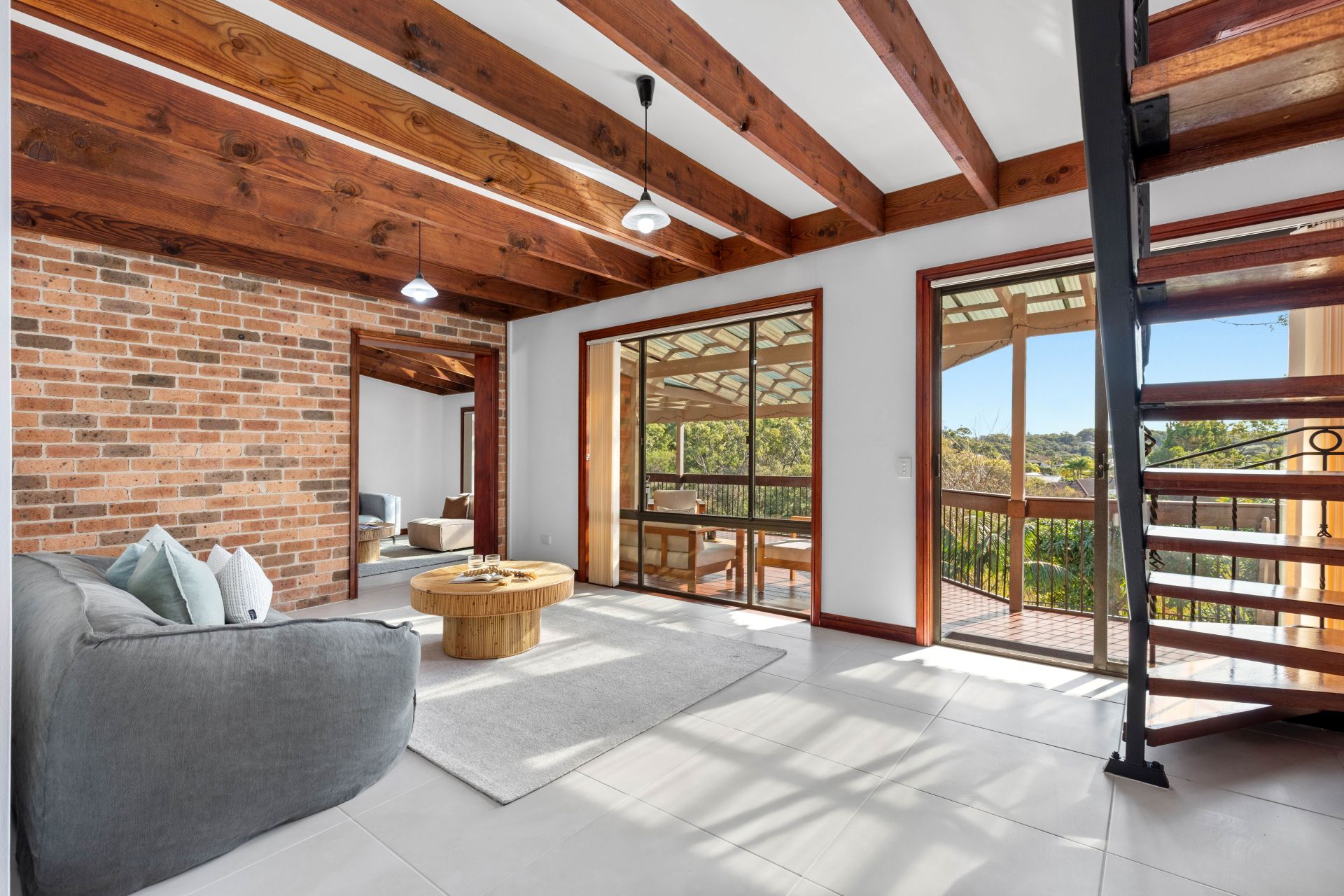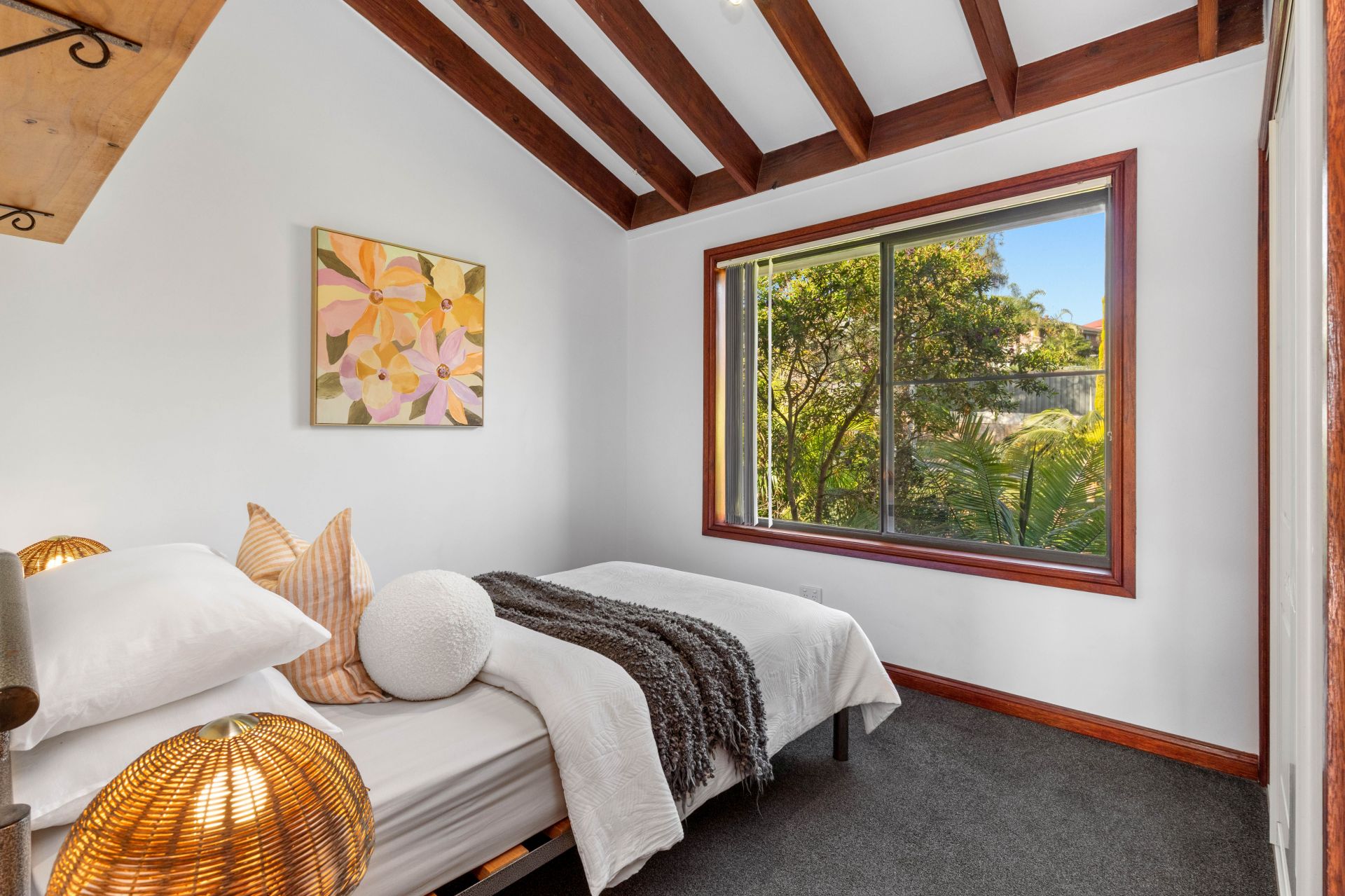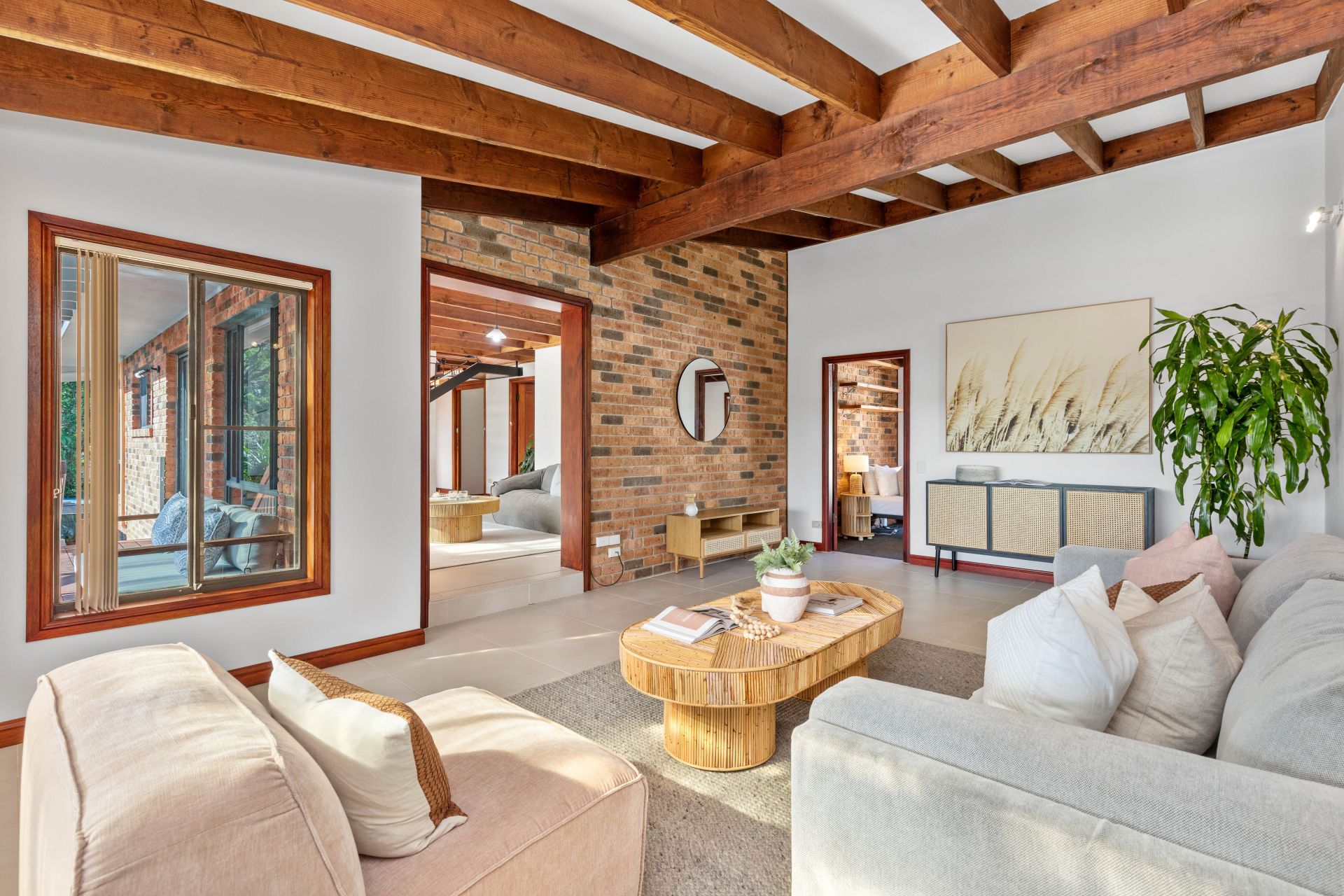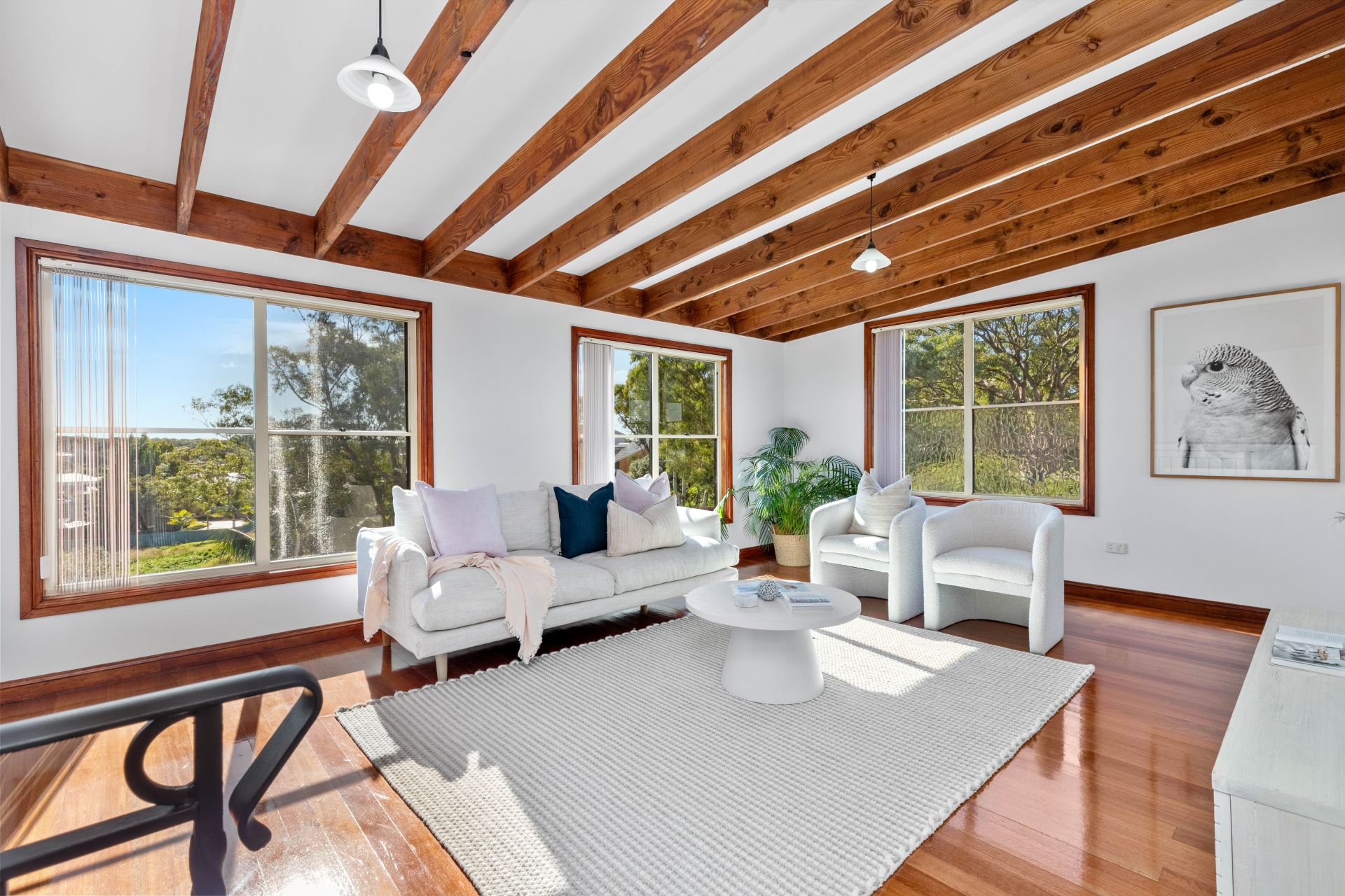 -Raked ceilings with exposed beams create an open, airy atmosphere