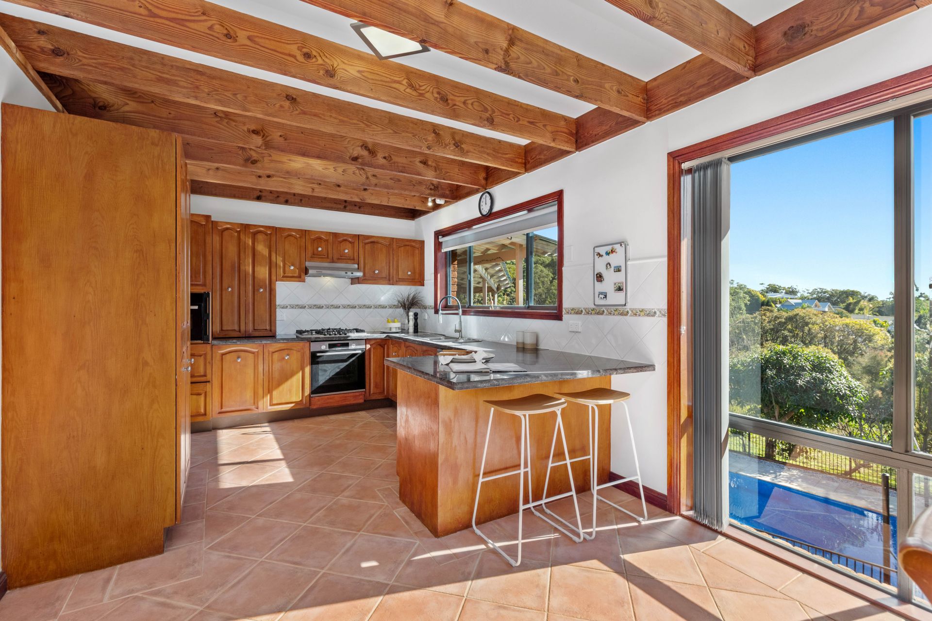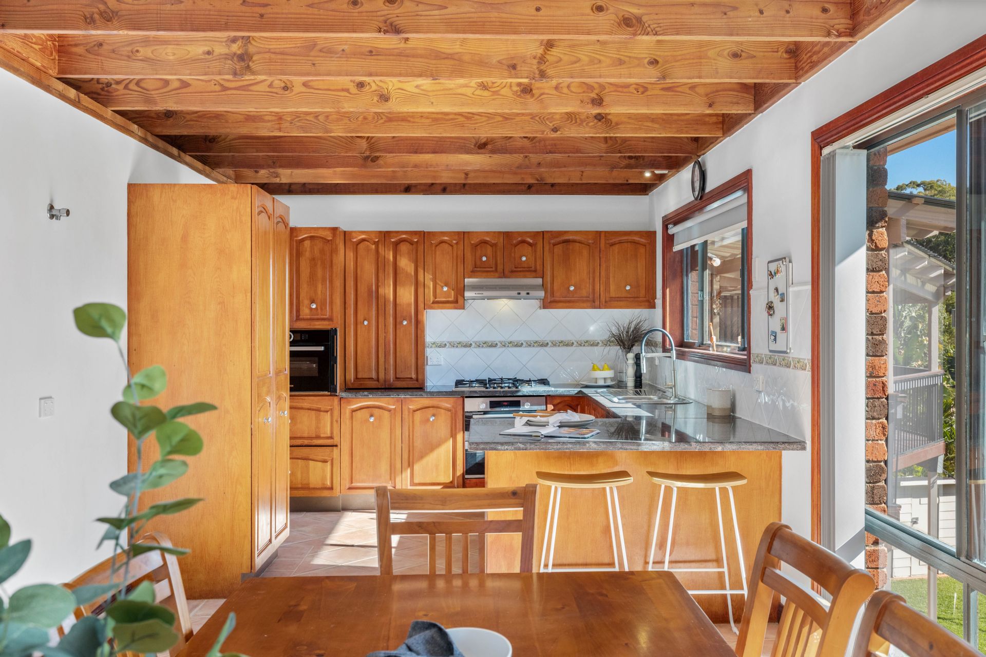 -Open-plan kitchen and dining area with large windows overlooking the north-facing backyard and reserve