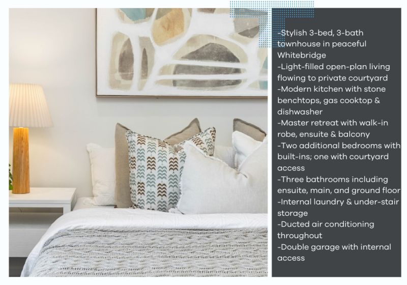 Tucked into the peaceful heart of Whitebridge, this stylish three-bedroom townhouse offers a low-maintenance lifestyle without compromise. Clean lines, a neutral palette, and an abundance of natural light create a calming backdrop for everyday living, while the open-plan kitchen, dining, and living area invites connection and flow. Large glass sliding doors extend the space outdoors to a private courtyard-the perfect spot for morning coffee, quiet reading, or alfresco catch-ups with friends, all with the ease of minimal upkeep.
